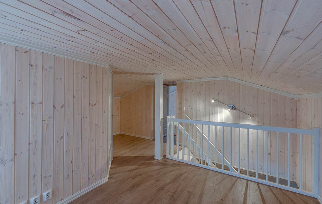 Hvitmalt rett trapp opp fra kjøkken/stue. Her finnes det en romslig tv-stue og en wc/vask. Det er utgang til overbygd balkong fra tv-stuen, terrassedør med vindusfelt. Hvitlasert skygge skrå panel på alle vegger. På gulv er det et slitesterkt parkettlaminat Kronotex Mammut Everest oak Silver med lyddempende filtbelegg under. Det er 3 soverom oppe. Hvitlasert skygge skrå panel på tak og vegger.