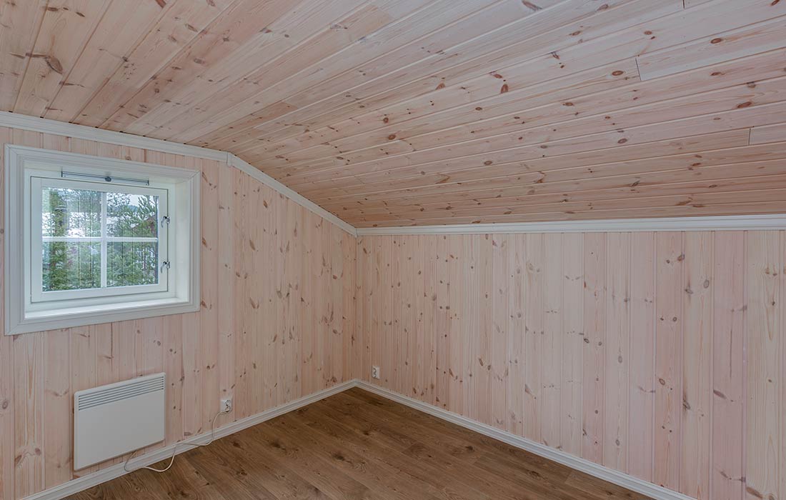 Innvendig høyde i 1 etg er ca. 230cm foruten kjøkkenet der det er ca. 275cm på midten av skråtaket. I 2. etg er høyden 220 cm. Alle innvendige vegger er isolert med Glava. Hvitlasert skygge skrå panel i alle tak.