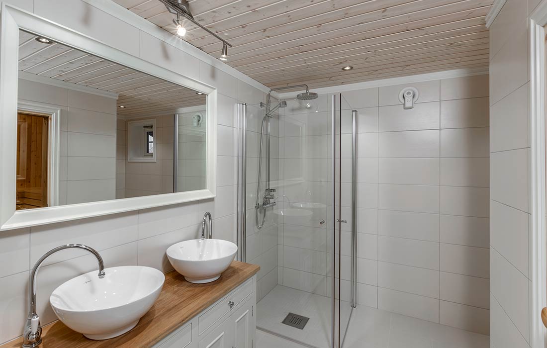 Lekkert flislagt bad med 30x30 beige fliser på gulv, 2x2 mosaikkfliser i dusjhjørne og avlange beige fliser på veggene. Dobbel baderominnredning med og tilhørende speil. Veggmontert wc. 90x90 dusjhjørne med Akita dusj. Badstue med vinkelbenk og røkfarget glassdør. 3 downlights i tak samt spotskinne over speilet med 3 spotter. Eget badstuelys. Avtrekk som styres manuelt fra utsiden av badet.