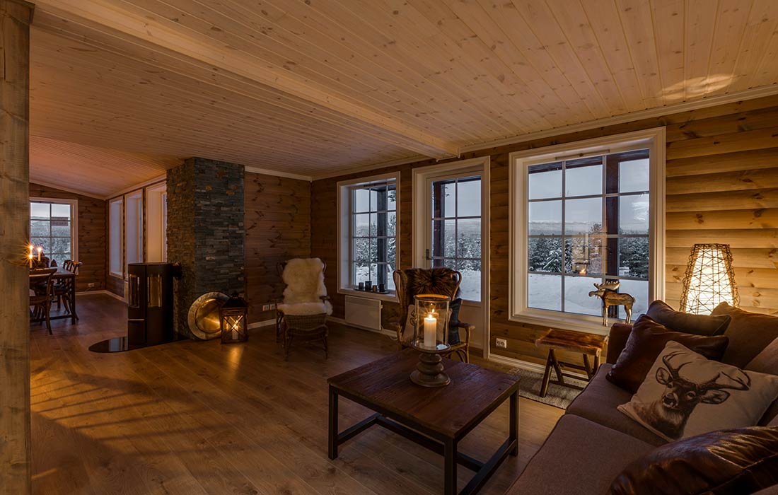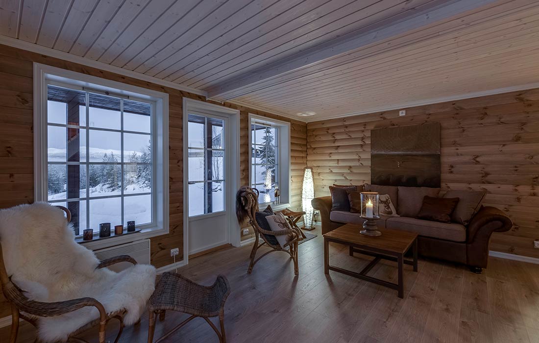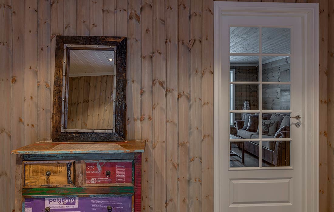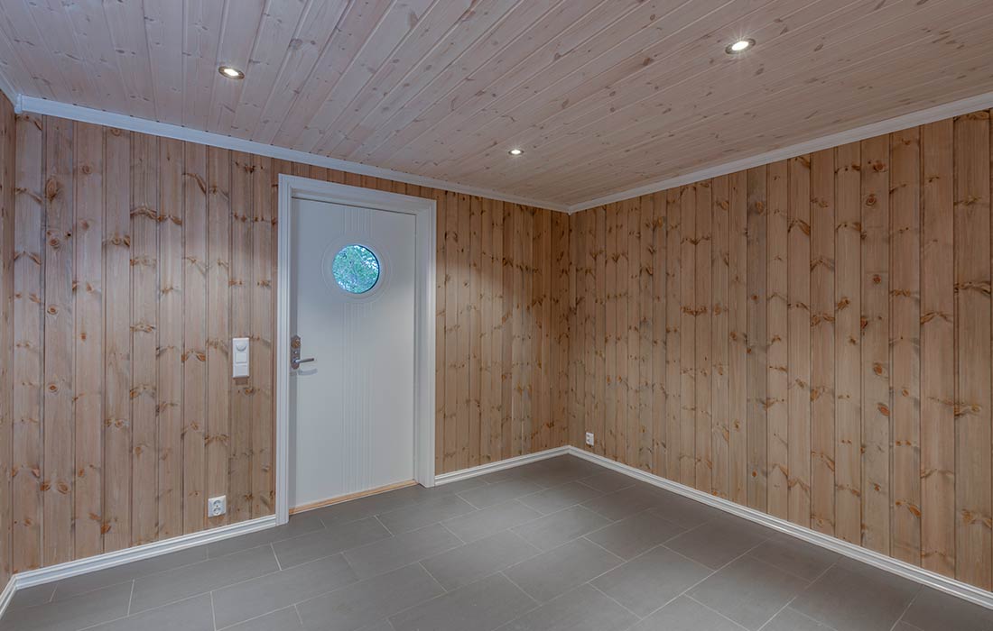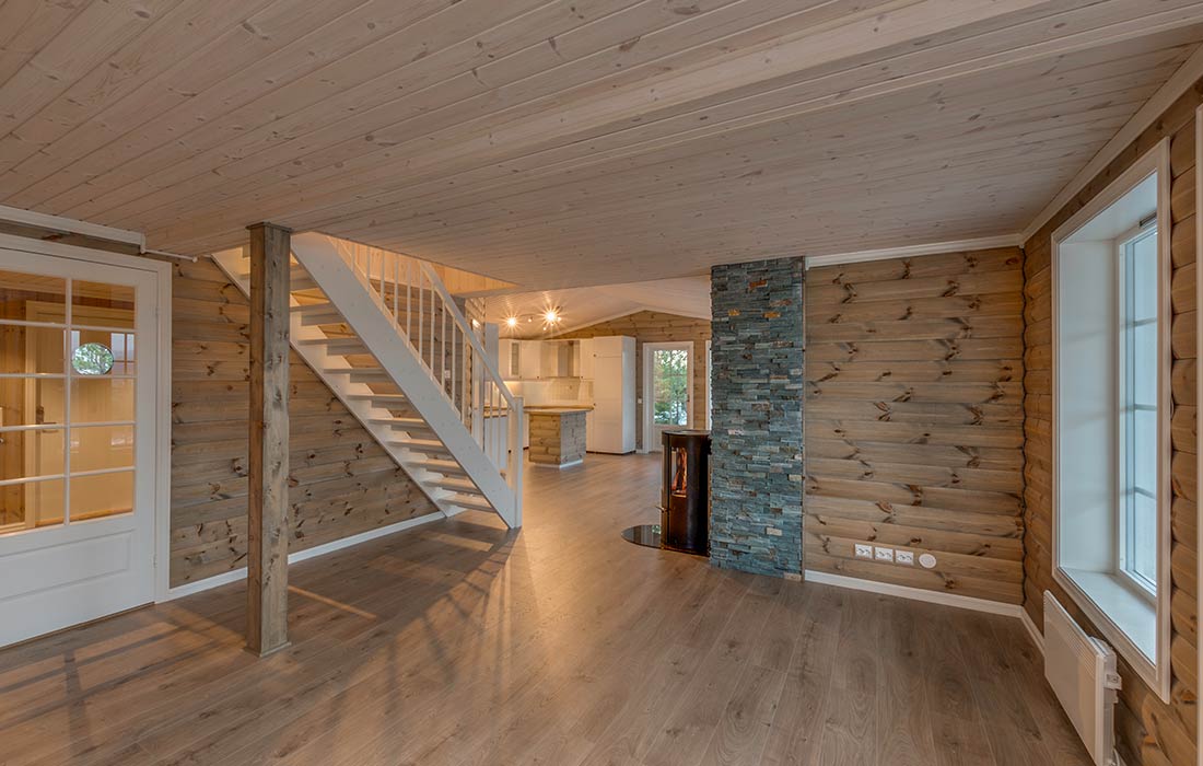 Liggende rundtømmerpanel behandlet med Tyrilin interiørbeis med fargen Skumring. På gulv er det et slitesterkt parkettlaminat Kronotex Mammut Everest oak Silver. Dør med glassfelt fra gangen og inn til stuen. I gangen mellom stue og bad/soverom er det Oyster-lampe i tak. Opplegg til lampe over sofa.