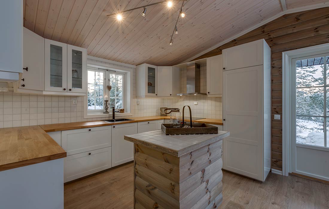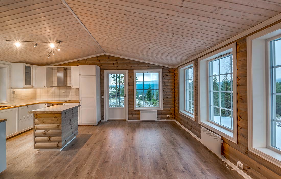 Liggende rundtømmerpanel behandlet med Tyrilin interiørbeis med fargen Skumring. På gulv er det et slitesterkt parkettlaminat Kronotex Mammut Everest oak Silver. Spotskinne med 6 spotter med dimmer. Opplegg for spisestuelampe med dimmer. Stort, romslig og praktisk Ikea kjøkken med Bodbyn fronter. Eik benkeplate. På øy er det lagt fliser istedenfor benkeplate – her kan man sette varme ting rett på; veldig praktisk. Lys under overskap. Oppvaskmaskin, komfyr, induksjonstopp, komfyrvakt, fryseskap under benken, helt, stort kjøleskap. Store, romslige skuffer. Glassdører i noen overskap.