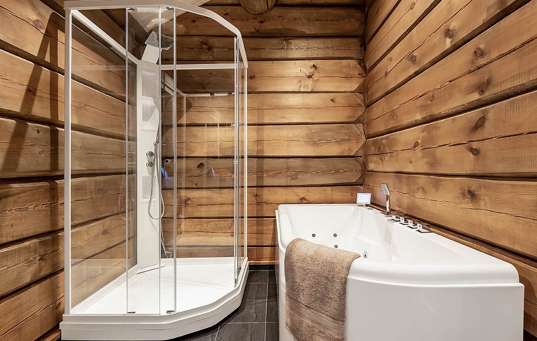 Flislagt 30x60 grå fliser og varmekabler. Tømmeret er behandlet med Tyrilin interiørbeis med fargen Stemning. 4 stk downlights med dimming.