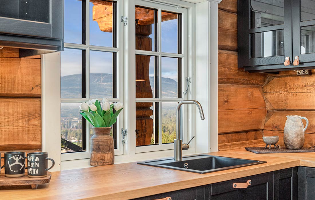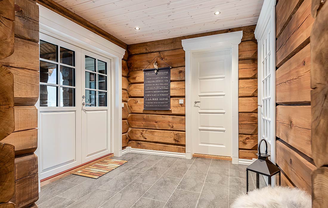 Hvitmalte utforinger til alle vinduer og dører. Hvitmalte profilerte 90mm lister i hele hytta.