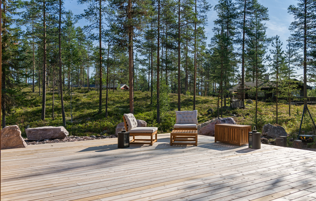 • Gedigen terrasse på ca 60m2 på 3 sider av hytta, flott uteområde. Overbygd inngangsparti.