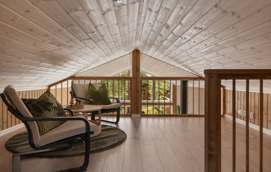 • Kronotex Mammut Oak Beige parkettlaminat på gulv, furupanel skygge skrå med fargen Stemning, hvitmalte profilerte lister og utforinger, hvitlasert skygge skrå panel i tak. Friskluftsventil.