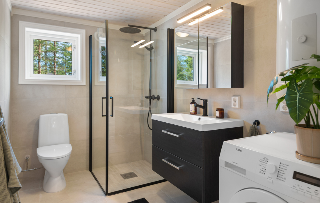 • Svarte armaturer og dusjkran. Svart avtrekksvifte og svarte brytere og stikkontakt,