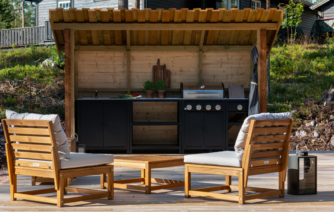 Gedigen terrasse med utekjøkken og egen grillplass med bålpanne.
