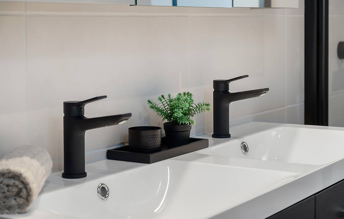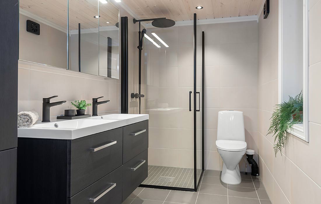 Svarte armaturer og dusjkran. Svart avtrekksvifte og svarte brytere og stikkontakt,