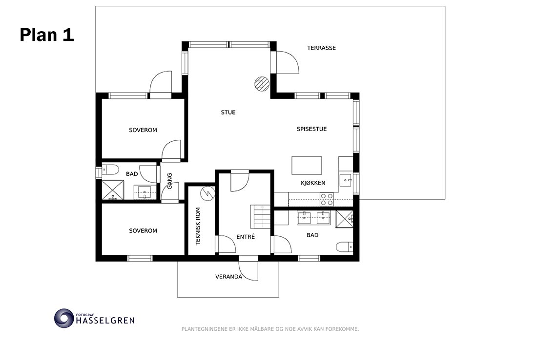 3 stk doble stikkontakter, 7 stk downlights med dimmer, 2 store vinduer på 160 x 180, ett på 90 x 180 og terrassedør 90 x 200 med utgang til terrasse. Panelovn.
