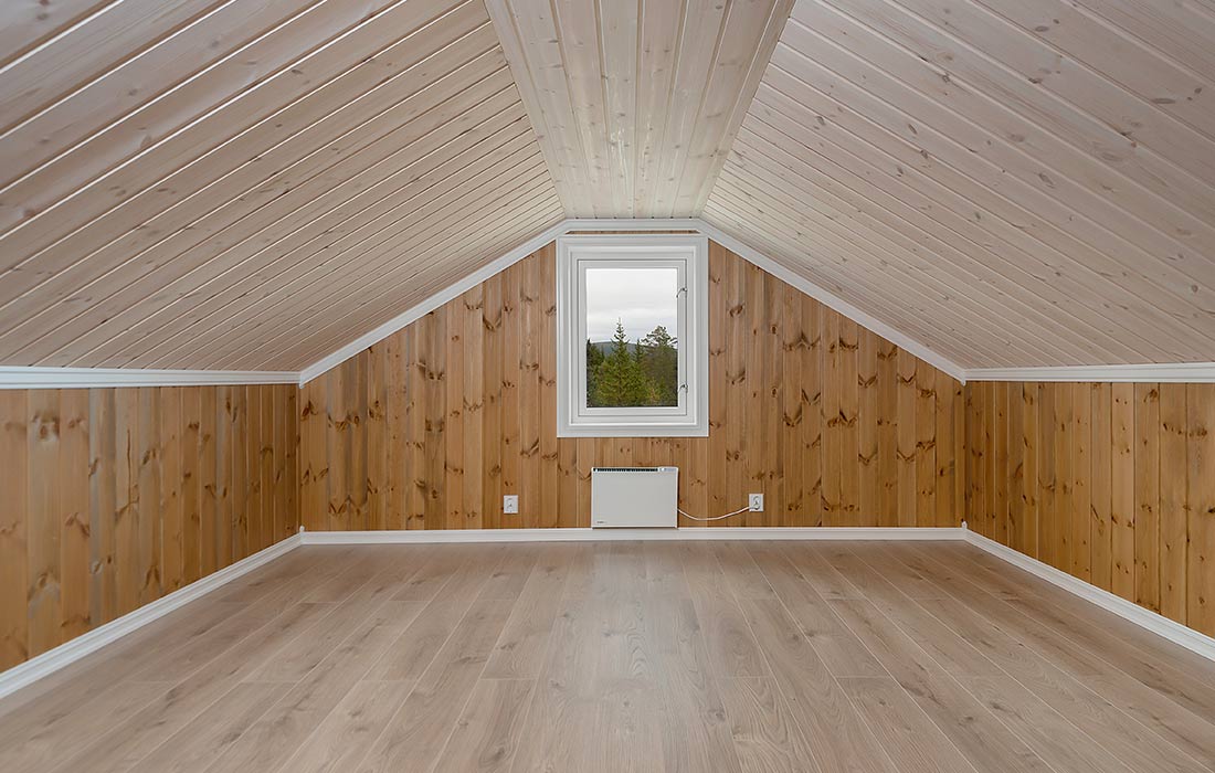 Alle innvendige vegger er isolert med Glava. Hvitlasert skygge skrå panel i alle tak.